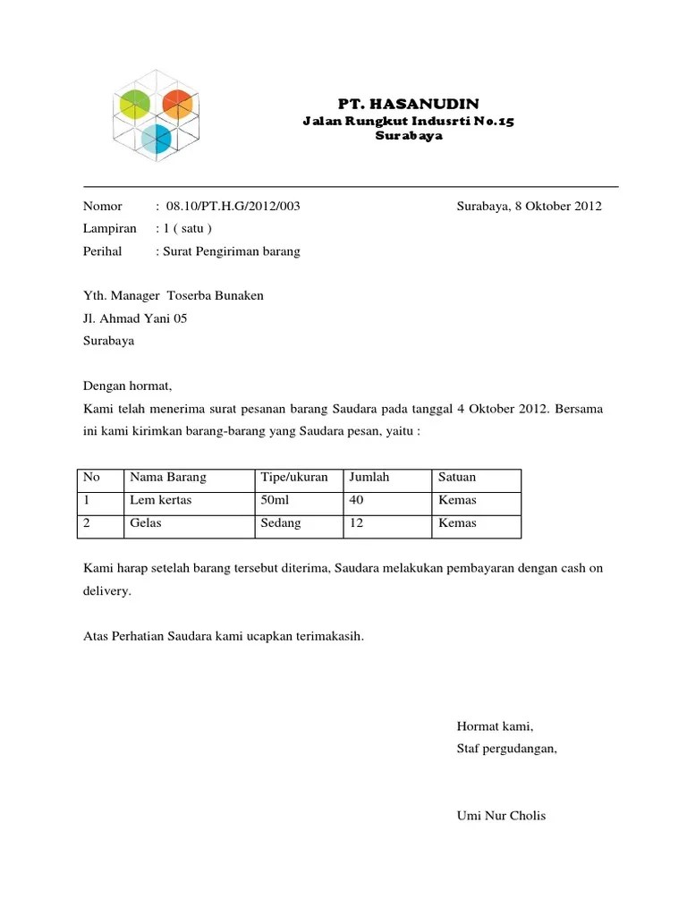 Surat pesanan adalah surat yang dibuat oleh calon pembeli kepada. Surat ini dibuat oleh pihak . Surat pengiriman barang adalah surat yang dibuat dengan maksud dan tujuan agar pembeli mempunyai persiapan untuk penerimaan barang tersebut . Jadi surat jalan barang merupakan sebuah dokumen penting untuk melakukan kegiatan pengiriman barang yang wajib dibawa, oleh pihak pengiriman barang atau sopir . Surat pemberitahuan pengiriman barang dibuat oleh penjual setelah penjual dan pembeli .